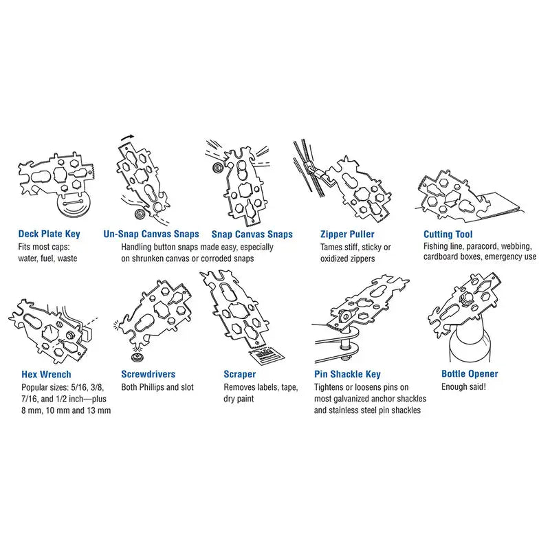 The Davis Snap Tool Multi-Key is a versatile, stainless steel deck plate tool designed for strength and convenience. Universal and handy, it provides a reliable solution for a wide range of outdoor and recreational activities. Ideal for fishing, hiking, climbing, boating, biking, camping, sailing, tailgating, and RV adventures, this compact tool is built to handle multiple tasks with ease, making it a must-have for enthusiasts on the go.