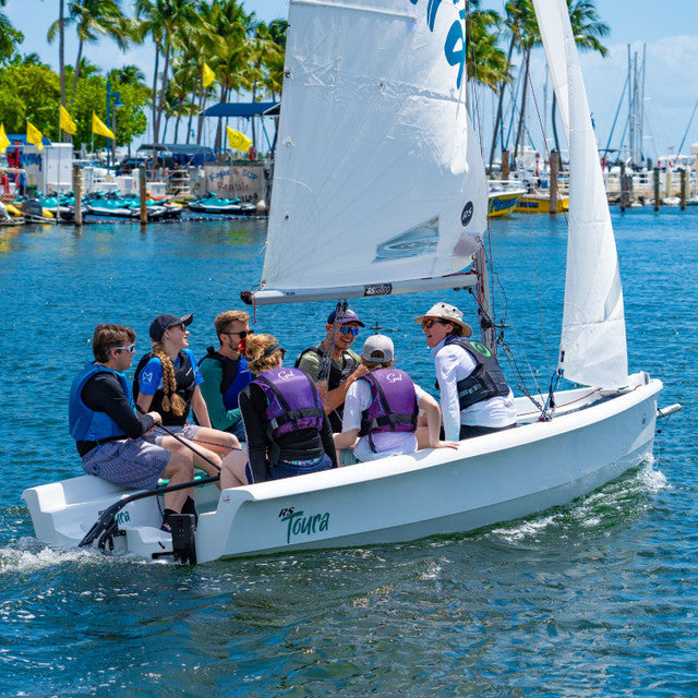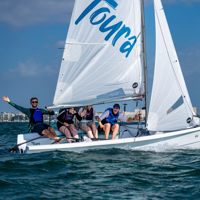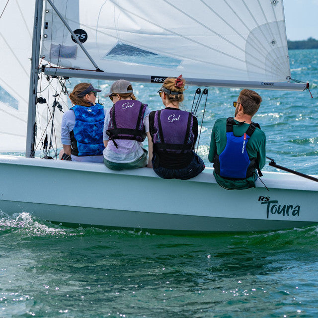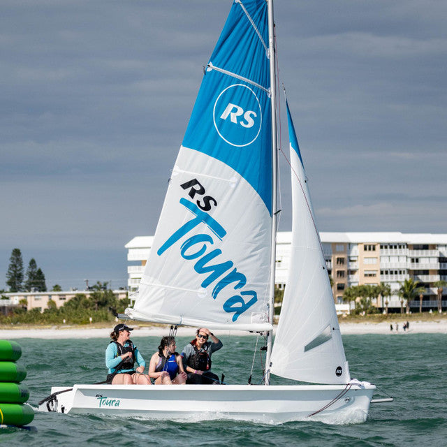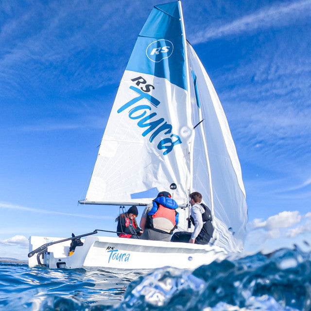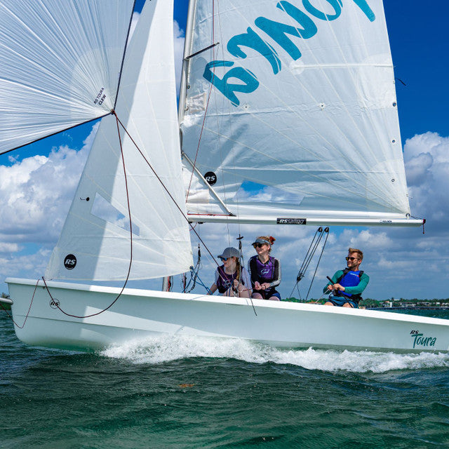 The RS Toura is a spacious and stable modern dinghy designed for family sailing, training programs, and coastal adventures. Positioned between the Quest and Venture models in the RS range, the Toura offers exceptional cockpit space with capacity for up to seven crew members, making it ideal for group outings and instructional use.